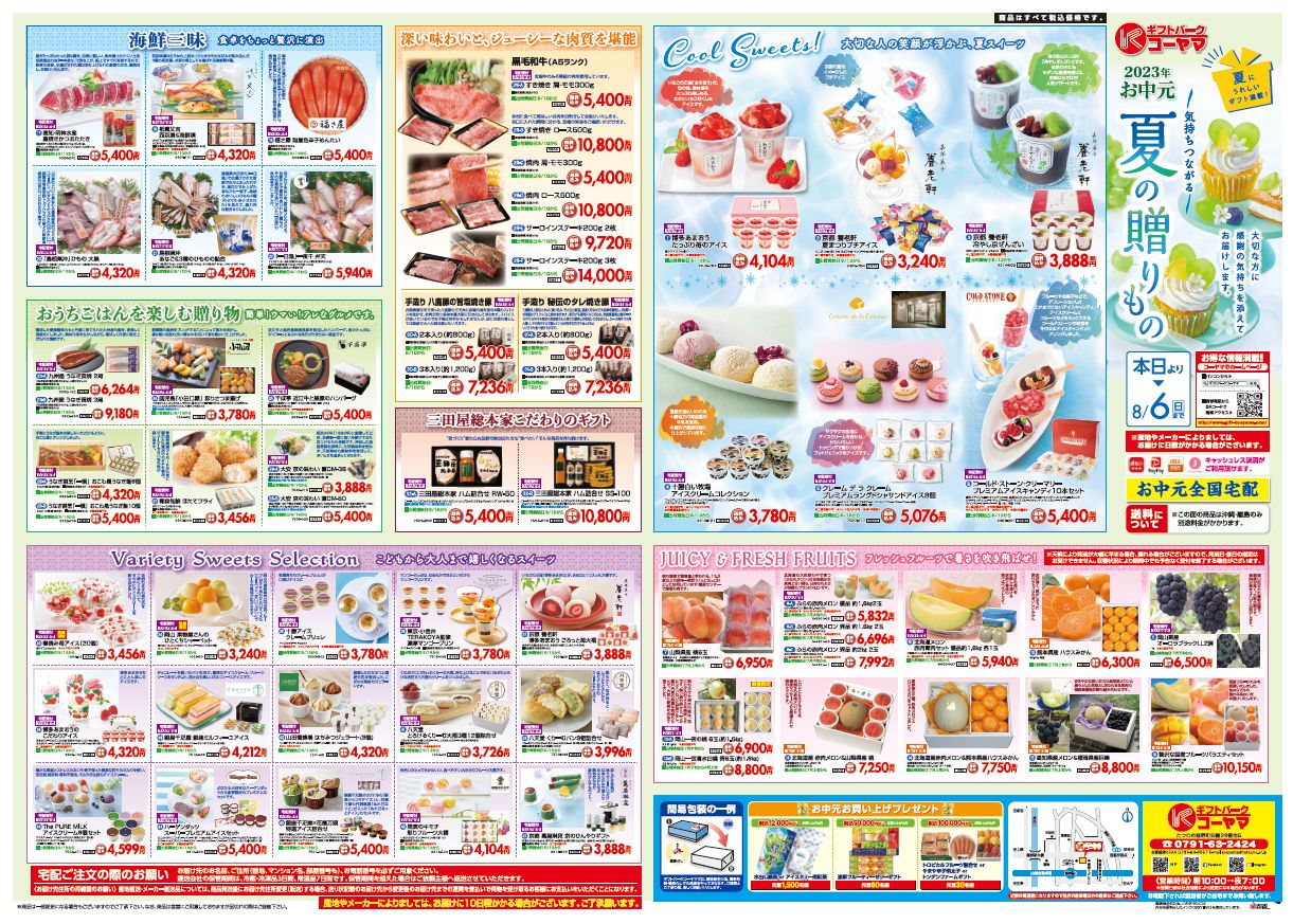 販売促進・集客チラシお中元ギフト特集の告知・集客チラシ兵庫県たつの市で贈答ギフトの販売をされているギフトパークコーヤマ様より折込チラシ制作のご依頼を頂きました。今回の企画は「お中元ギフト」特集に…